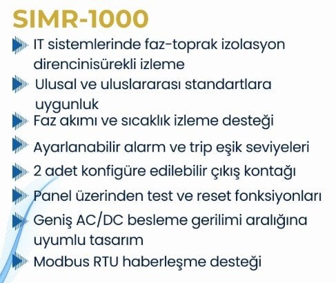 SIMR-1000, başta Güneş Enerjisi Santralleri (GES) olmak üzere IT (izole topraklı) sistemlerde faz–toprak arasındaki izolasyon direncini sürekli izleyen gelişmiş bir izolasyon izleme rölesidir. Olası izolasyon hatalarını erken aşamada tespit ederek sistem güvenliğini artırır ve arızaların büyümeden önlenmesine yardımcı olur.